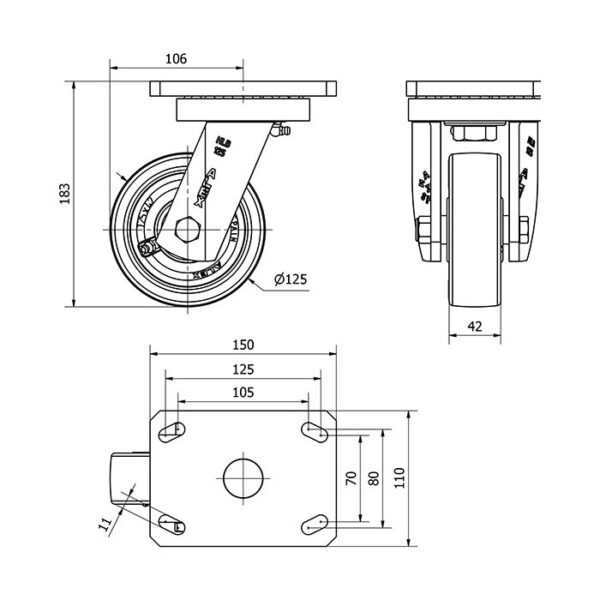 Rueda poliuretano giratoria Alex diametro 125 mm. modelo 2-0484