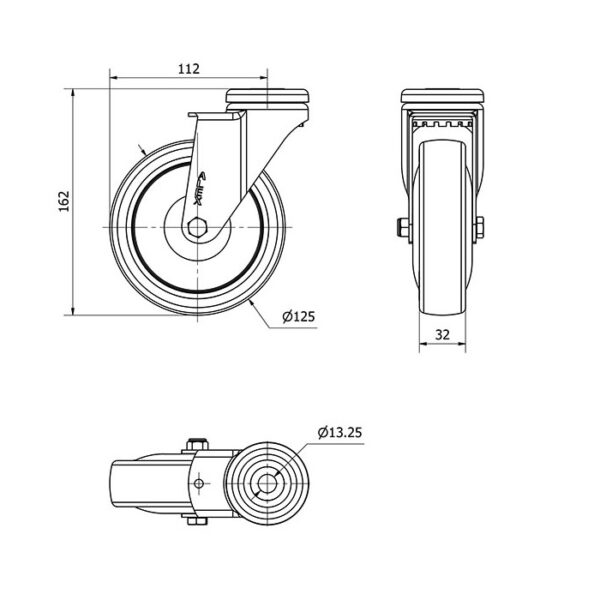 Rueda poliuretano giratoria Alex diametro 125 mm. modelo 2-1041