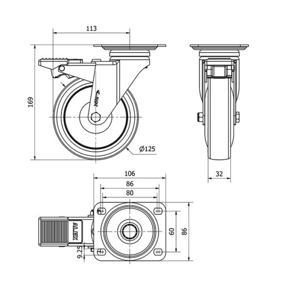 Rueda poliuretano giratoria Alex diametro 125 mm. modelo 2-1042 EAN 8422202210421