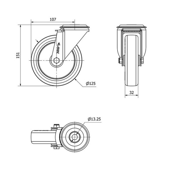 Rueda poliuretano giratoria Alex diametro 125 mm. modelo 2-2437