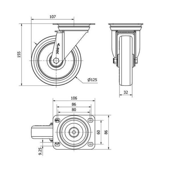 Rueda poliuretano giratoria Alex diametro 125 mm. modelo 2-2931 EAN 8422202229317