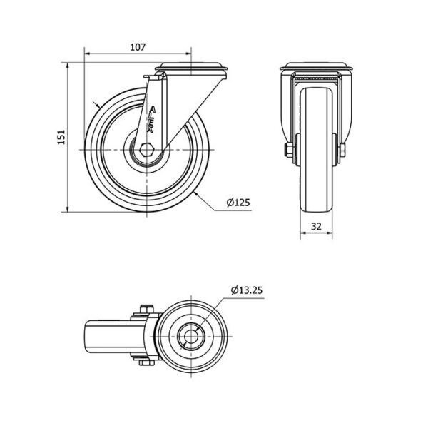Rueda poliuretano giratoria Alex diametro 125 mm. modelo 2-2940