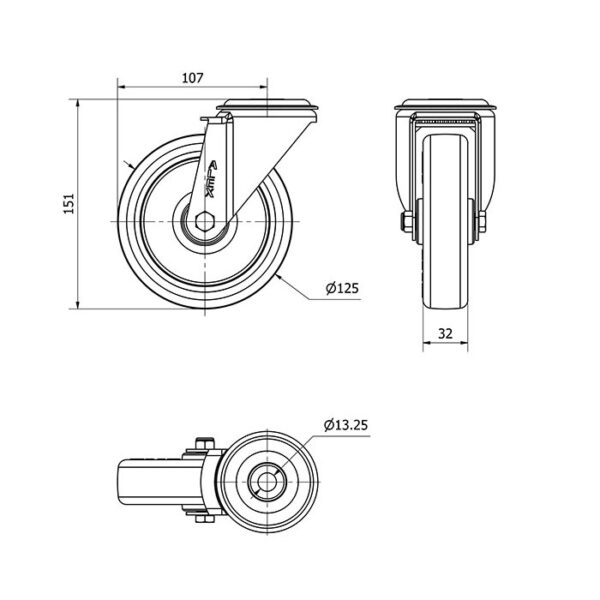 Rueda poliuretano giratoria Alex diametro 125 mm. modelo 2-2955