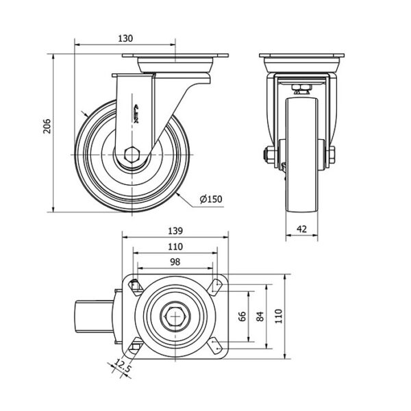 Rueda poliuretano giratoria Alex diametro 150 mm. modelo 2-0307