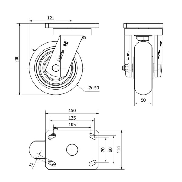 Rueda poliuretano giratoria Alex diametro 150 mm. modelo 2-3534