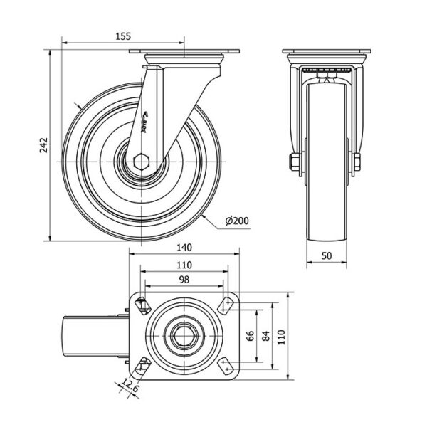 Rueda poliuretano giratoria Alex diametro 200 mm. modelo 2-2007