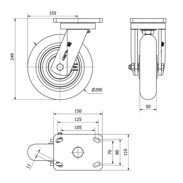 Rueda poliuretano giratoria Alex diametro 200 mm. modelo 2-3535