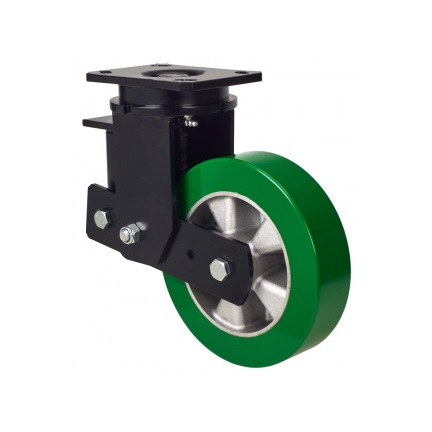 Las ruedas Alex serie HLSB-AUGB son ruedas con el núcleo de aluminio y la banda de poliuretano verde fundido con dureza de 80º shore A, indicadas para soportar altas cargas de hasta 700 Kg. Con soporte de suspensión elástica, mediante la incorporación de un muelle muy resistente para absorber golpes, choques y desniveles. Recorrido de suspensión hasta 25 mm., ideal en suelos irregulares donde su amortiguación actúa. Se utilizan en útiles de transporte logístico, gradas móviles, plataformas elevadoras, carros de transporte, maquinaria pesada del sector de la construcción y grúas móviles. AUGB: Poliuretano verde de gran capacidad de carga y absorción de golpes.