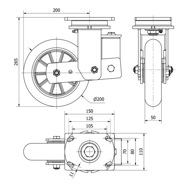 Rueda poliuretano giratoria Alex diametro 200 mm. modelo 2-4056