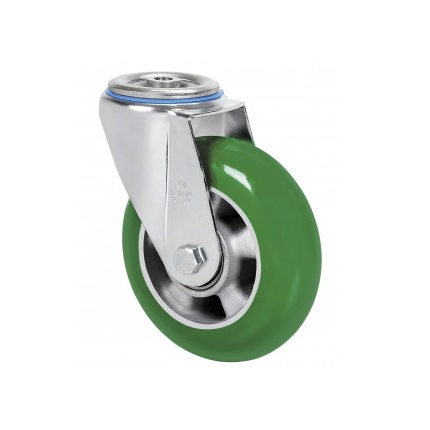 La serie de ruedas Alex ZV-AUAGB son ruedas con el núcleo de aluminio y la banda de forma balona de poliuretano verde de dureza 80º shore A, indicadas para soportar cargas hasta 650 Kg. Se utilizan en útiles de transporte logístico, carros de herramientas, carros tubulares, fábricas de neumáticos, plataformas elevadoras, carros de transporte, escaleras, barredoras, pulidoras, maquinas embalaje, cintas transportadoras, grúas móviles, carretillas elevadoras, caldererías, ebanistas, carpinterías metálicas, granjas agrícolas, mesas elevadoras, cárnicas, contenedores y polideportivos. AUAGB: Rueda con banda de rodadura en forma balona, con menor esfuerzo al giro y desplazamiento. Poliuretano verde de gran capacidad de carga.