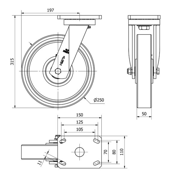 Rueda poliuretano giratoria Alex diametro 250 mm. modelo 2-2294