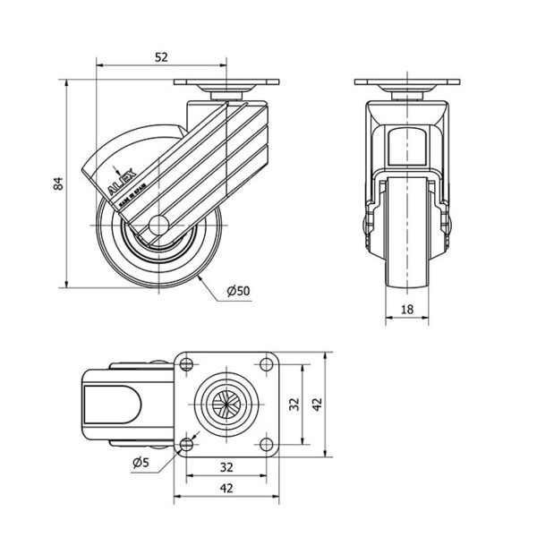Rueda poliuretano giratoria Alex diametro 50 mm. modelo 1-0759