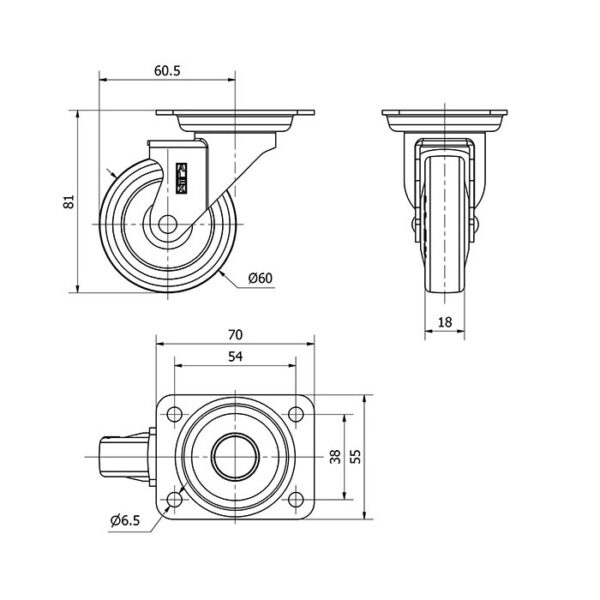 Rueda poliuretano giratoria Alex diametro 60 mm. modelo 1-0745