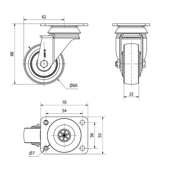 Rueda poliuretano giratoria Alex diametro 60 mm. modelo 2-2522