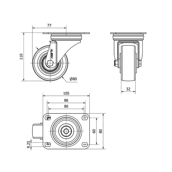 Rueda poliuretano giratoria Alex diametro 80 mm. 2-0335