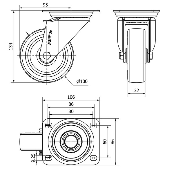 Rueda poliuretano giratoria Alex diametro 80 mm. modelo 2-2820