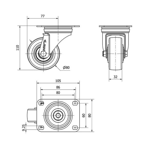 Rueda poliuretano giratoria Alex diametro 80 mm. modelo 2-4221