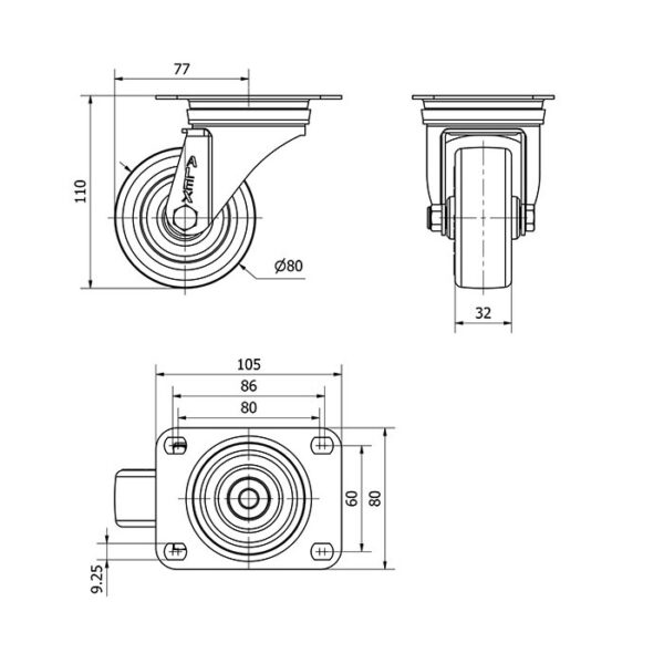 Rueda poliuretano giratoria Alex diametro 80 mm. modelo 2-4691