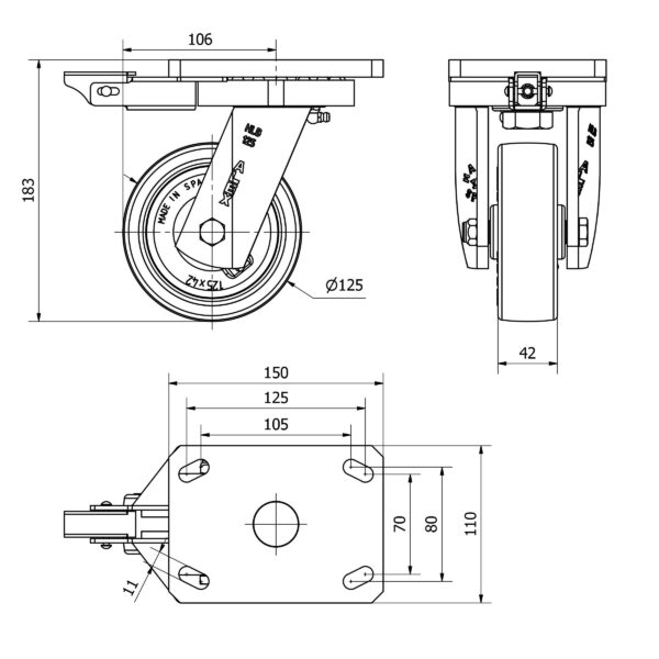 Rueda poliuretano giratoria con bloqueo direccional Alex diametro 125 mm. modelo 2-3361 EAN 8422202233611