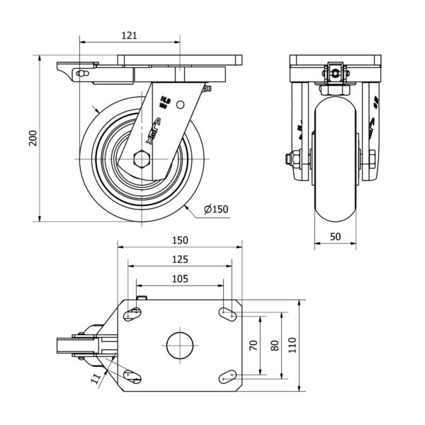Rueda poliuretano giratoria con bloqueo direccional Alex diametro 150 mm. modelo 2-3540
