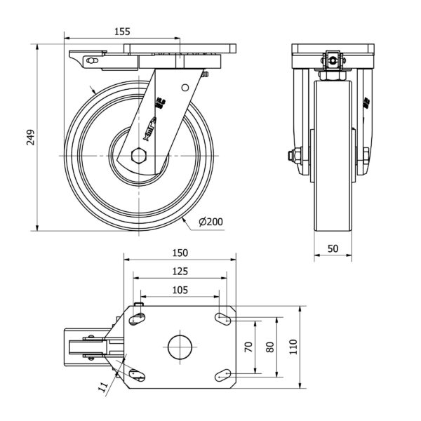Rueda poliuretano giratoria con bloqueo direccional Alex diametro 200 mm. modelo 2-3370 EAN 8422202233703
