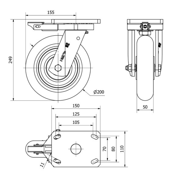 Rueda poliuretano giratoria con bloqueo direccional Alex diametro 200 mm. modelo 2-3541