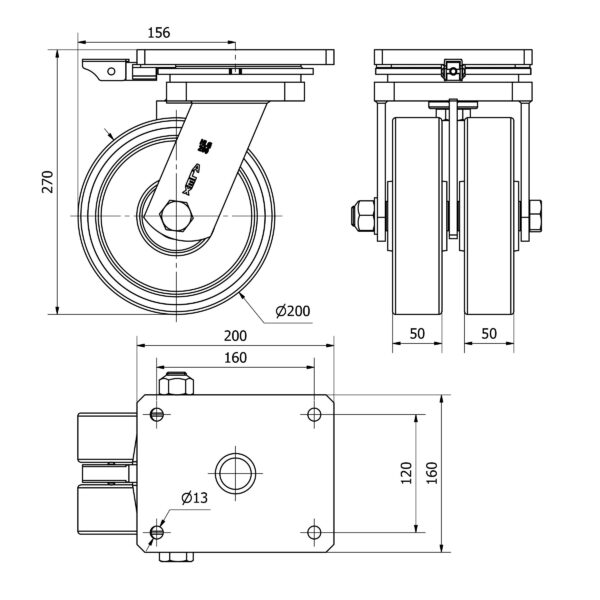 Rueda poliuretano giratoria con bloqueo direccional Alex diametro 200 mm. modelo 2-3829