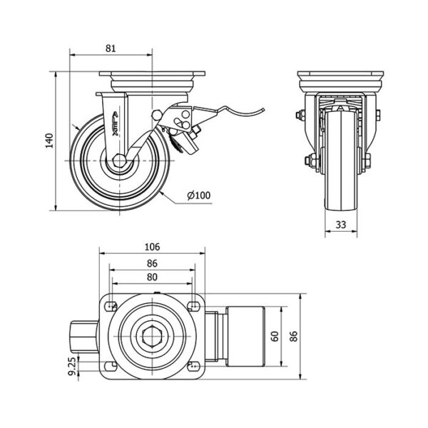 Rueda poliuretano giratoria con freno Alex diametro 100 mm. modelo 2-1612