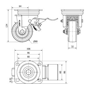 Rueda poliuretano giratoria con freno Alex diametro 100 mm. modelo 2-1612