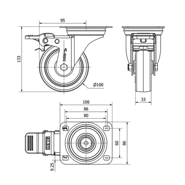 Rueda poliuretano giratoria con freno Alex diametro 100 mm. modelo 2-1652 EAN 8422202216522