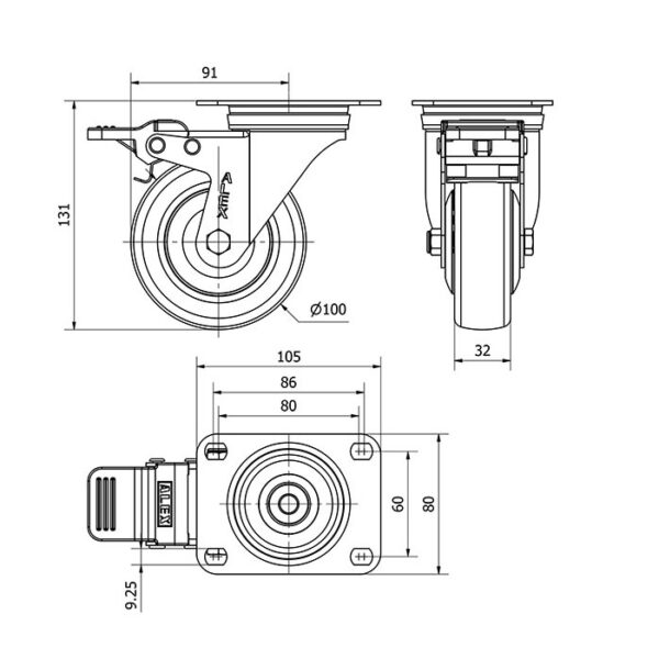 Rueda poliuretano giratoria con freno Alex diametro 100 mm. modelo 2-2015