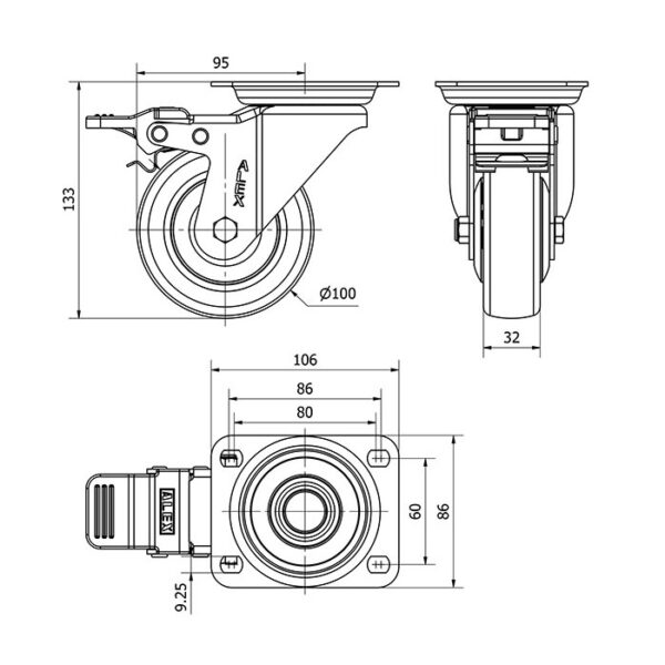 Rueda poliuretano giratoria con freno Alex diametro 100 mm. modelo 2-2016