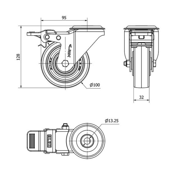 Rueda poliuretano giratoria con freno Alex diametro 100 mm. modelo 2-2331
