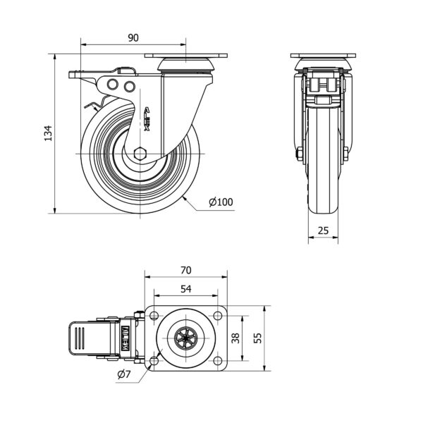 Rueda poliuretano giratoria con freno Alex diametro 100 mm. modelo 2-2465