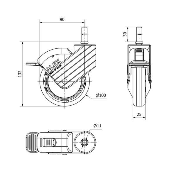 Rueda poliuretano giratoria con freno Alex diametro 100 mm. modelo 2-3574