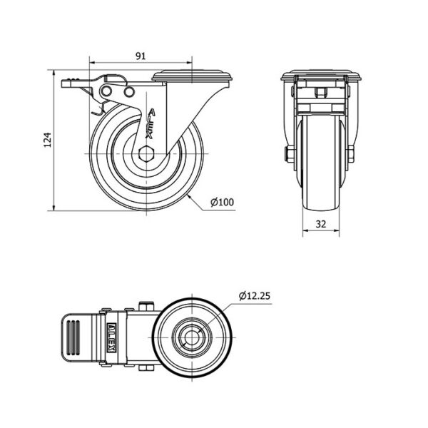 Rueda poliuretano giratoria con freno Alex diametro 100 mm. modelo 2-4108