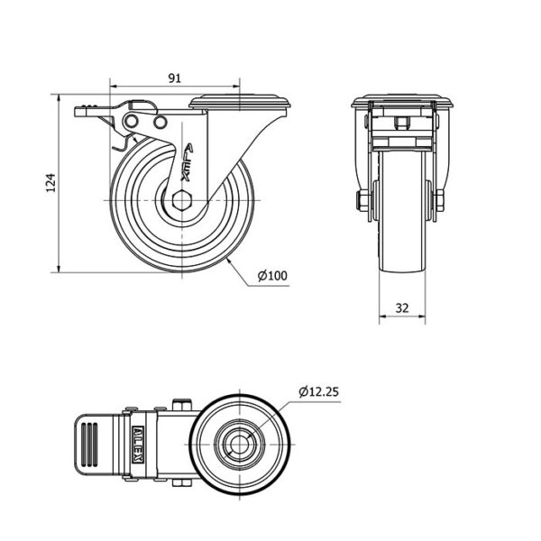 Rueda poliuretano giratoria con freno Alex diametro 100 mm. modelo 2-4117