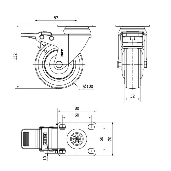 Rueda poliuretano giratoria con freno Alex diametro 100 mm. modelo 2-4728 EAN 8422202247281