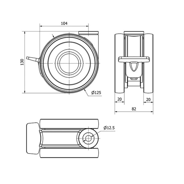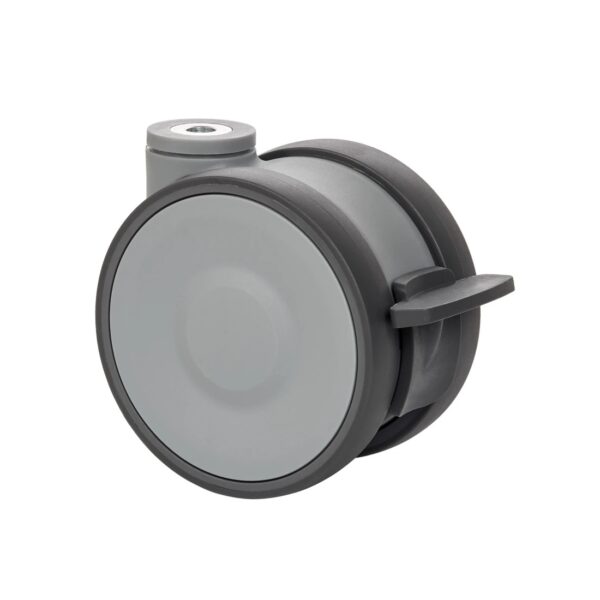 Rueda de poliuretano doble. Carcasa fabricada con fibra de vidrio reforzada en color gris. Soporte pivotante de fácil encaje. Cabezal giratorio con doble cojinete de bolas de precisión. Especialmente indicadas para soportar cargas de hasta 125 Kg.