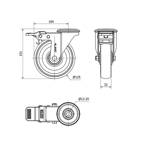 Rueda poliuretano giratoria con freno Alex diametro 125 mm. 2-0582