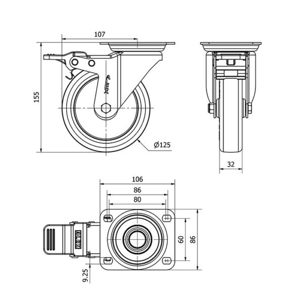 Rueda poliuretano giratoria con freno Alex diametro 125 mm. modelo 2-2369