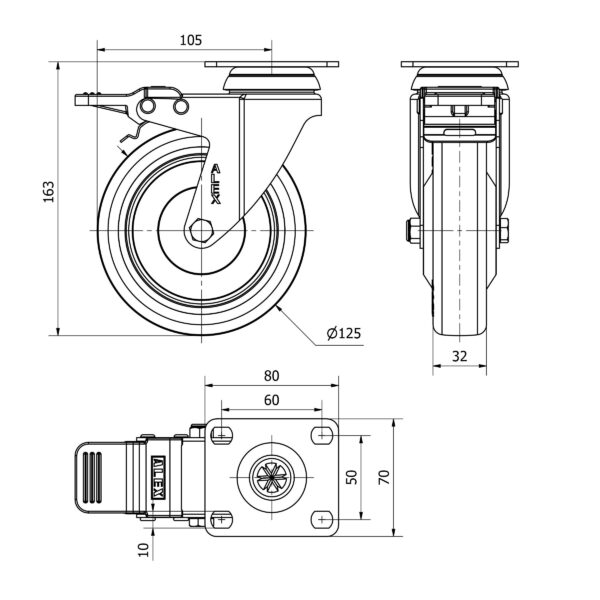 Rueda poliuretano giratoria con freno Alex diametro 125 mm. modelo 2-2466