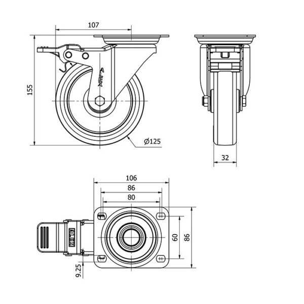 Rueda poliuretano giratoria con freno Alex diametro 125 mm. modelo 2-2922