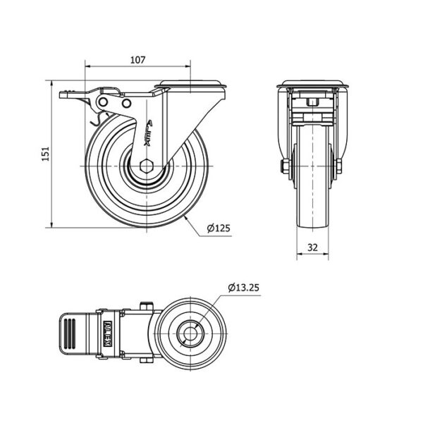 Rueda poliuretano giratoria con freno Alex diametro 125 mm. modelo 2-4220