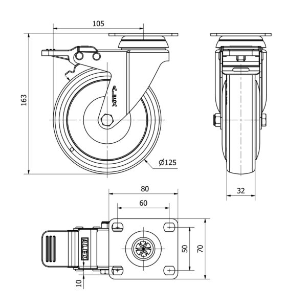 Rueda poliuretano giratoria con freno Alex diametro 125 mm. modelo 2-4734 EAN 8422202247342
