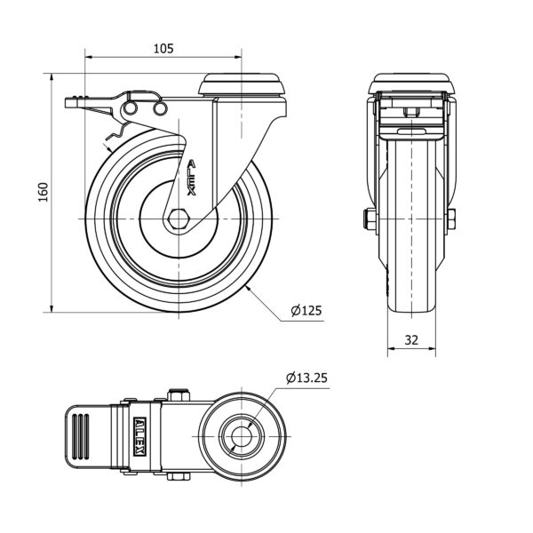 Rueda poliuretano giratoria con freno Alex diametro 125 mm. modelo 2-4773