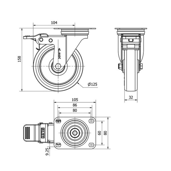 Rueda poliuretano giratoria con freno Alex diametro 125 mm. modelo 2-4960