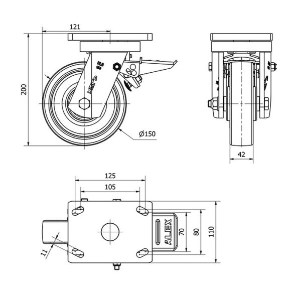 Rueda poliuretano giratoria con freno Alex diametro 150 mm. modelo 2-1529