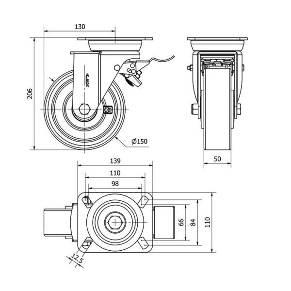 Rueda poliuretano giratoria con freno Alex diametro 150 mm. modelo 2-1845