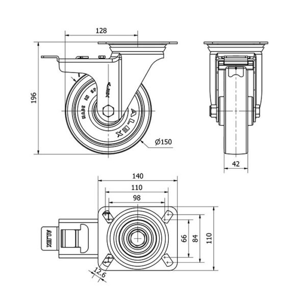 Rueda poliuretano giratoria con freno Alex diametro 150 mm. modelo 2-3483